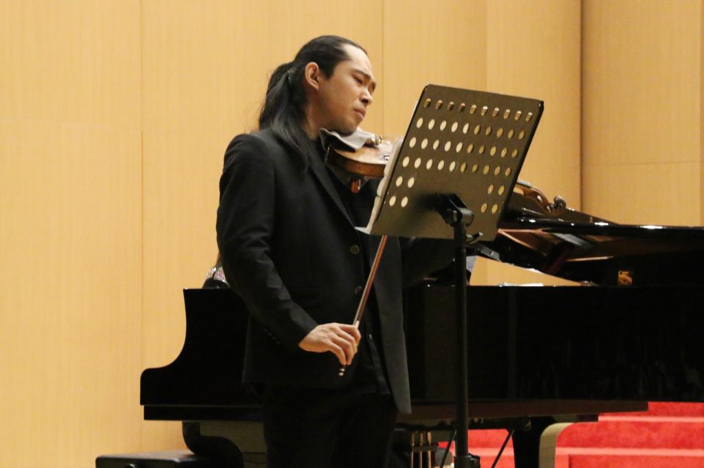 王威龙老师与王琼老师携手演奏了爱德华-格里格(AIEDVRD GREIG)《G大调第二小提琴钢琴奏鸣曲QP13》、郑雨贤《望春风》、莫里斯-拉威尔(MAURICE RAVEL)《G大调第二小提琴钢琴奏鸣曲》、儒勒-马奈斯(JULLES MASSENET)《沉思》和德米特里-肖斯塔科维奇(DMITRI SHOSTAKOVICH)《第一小提琴协奏曲三、四乐章OP.77》,演出一小时二十分钟,一气呵成。弦音激越,琴声悠扬,呈现了一场无与伦比的绝美视听盛宴,现场观众深深沉醉、意犹未尽。