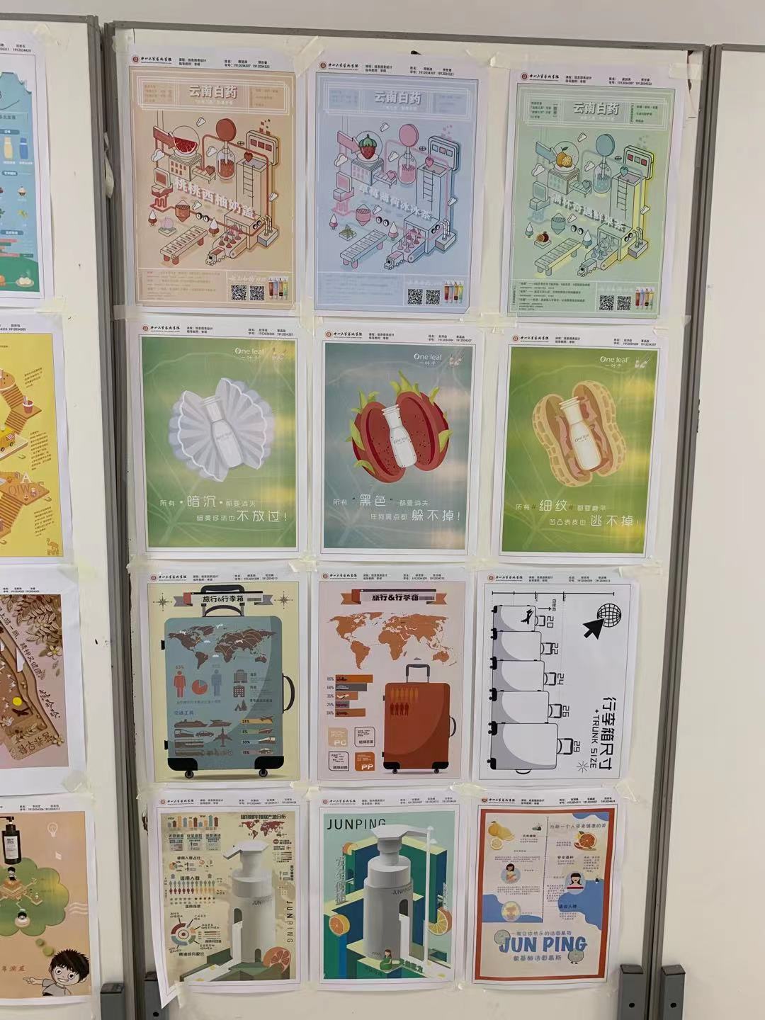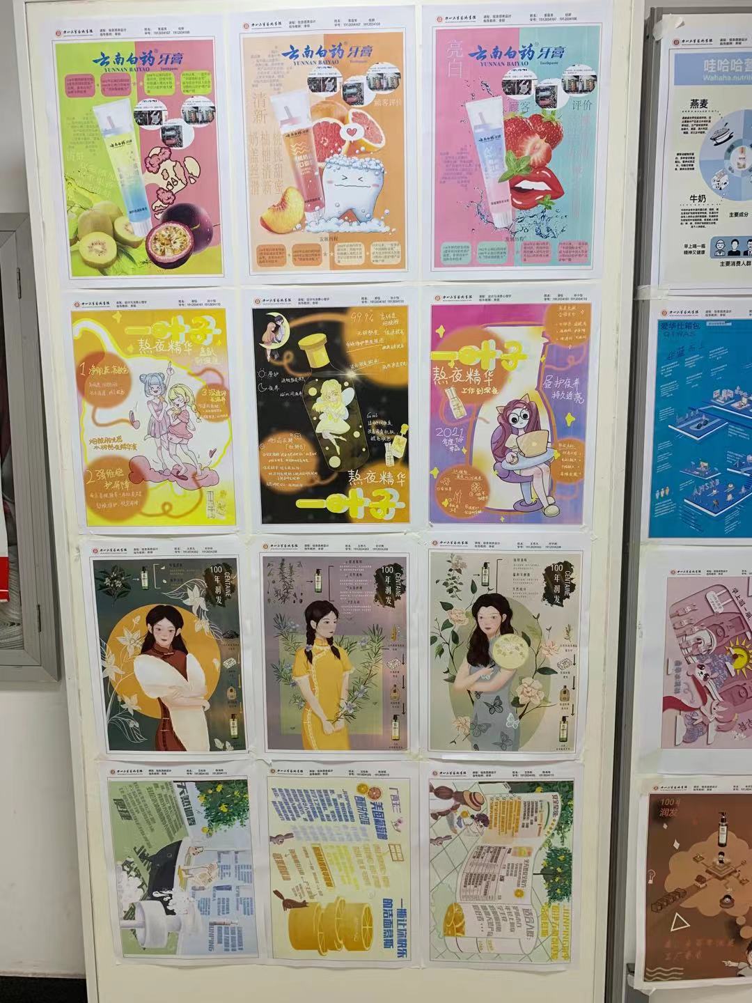学生作品以多个主题如爱华仕箱包、一叶子熬夜精华、俊平洗面奶以及哇哈哈和云南白药牙膏等为主题进行分析制作,各小组结合各自的研究方向进行视觉设计实践,分别涉及到主题海报插图设计、数据分析、市场调研、版式设计,策划案等。本次课程作业展以考核学生课程学习质量为目的,作为设计专业的学生,在展示设计作品的同时,也锻炼了展陈实践能力,提升了设计的审美能力,充分展示了同学们的艺术创造性,促进校园文明建设,引导大学生的健康成长起到了积极和推广作用。