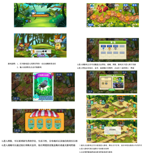游戏界面设计说明:这是一款关于保护鸟类的益智类游戏。在游戏中,玩家通过帮助小鸟通过重重障碍,获取能量进行闯关。在游戏过程中,会不断有食人花、小怪物等来捣乱,玩家必须通过战胜它们获取能量值,才能进入下一关。每个关卡所需的能量值逐渐提高,根据通关之后获取的相应能量值可以在应用商店购买通关所需的物品(炸弹,生命水,强力水等)。在规定时间内得到规定的能量值,过关后会有一个商店,商品简介在柜台下方的平台里。可用QQ或微信登录和自己的好友共同闯关,提升自己的等级。