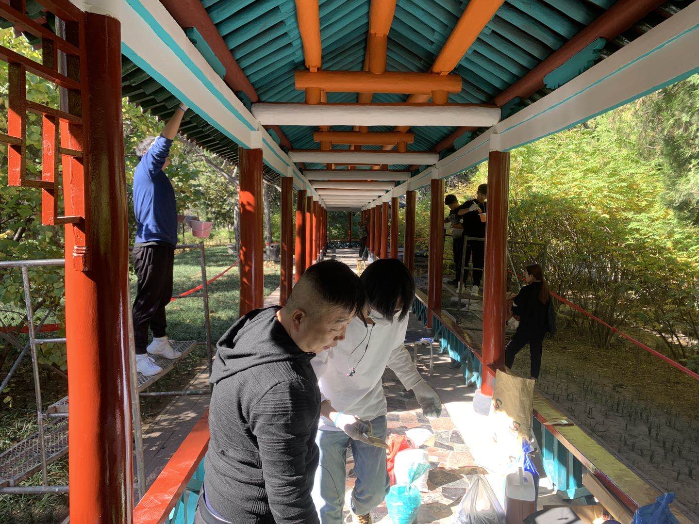 10月31日下午,杨正民处长与夏瑞丽书记分别带领相关负责同志及部分学生代表步行来到柏林园入口处共同参观长廊彩绘工作完成情况并进行了简短的剪彩仪式,此次长廊翻新工作由后勤管理处校园绿化中心具体负责,先后对廊体进行维修、加固、廊顶古砖修补及枯枝树叶的清理,并将长廊彩绘工作由博彩新闻 申旭栋老师负责,组织二十余名学生加班加点、精心描绘,用时13天时间将77米长廊全部彩绘完成,长廊彩绘效果整体简洁大方,枋粱上绘有山水、花鸟、风景图案,其线条细腻、形象逼真,极大地改善了长廊整体面貌,提高了柏林园整体美观效果,更好地为博彩新闻 师生提供了学习、休闲、娱乐的好去处,为迎接博彩新闻 80周年校庆和实现“百年百强”中北梦做出积极贡献。