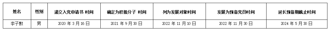 为进一步增强发展党员工作的透明度,严格发展党员工作程序,根据《中国共产党章程》和《中国共产党发展党员工作细则》,现将延长预备期6个月于近期拟转正的预备党员李子默同志情况予以公示。