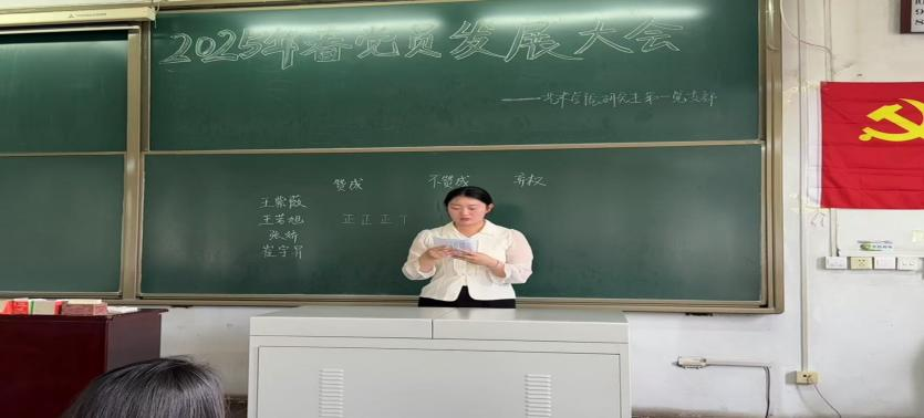研究生第一党支部在12号楼三层本科生教室召开2025年春季党员发展大会。大会讨论4位预备党员王紫薇、崔宇昇、张娇、王若旭按期转为中共正式党员的问题。支部共有党员26名,应到26名,实到25名,未到1人。应到会有表决权的正式党员19名,实到会有表决权的正式党员18名。有表决权的正式党员到会人数超过应到会有表决权人数的半数,符合会议规定人数。
